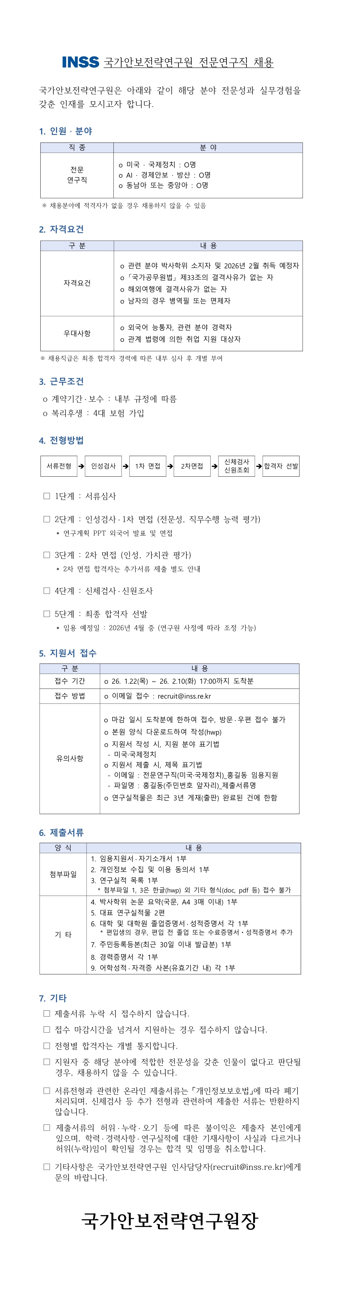 [채용공고] 국가안보전략연구원 전문연구직 채용